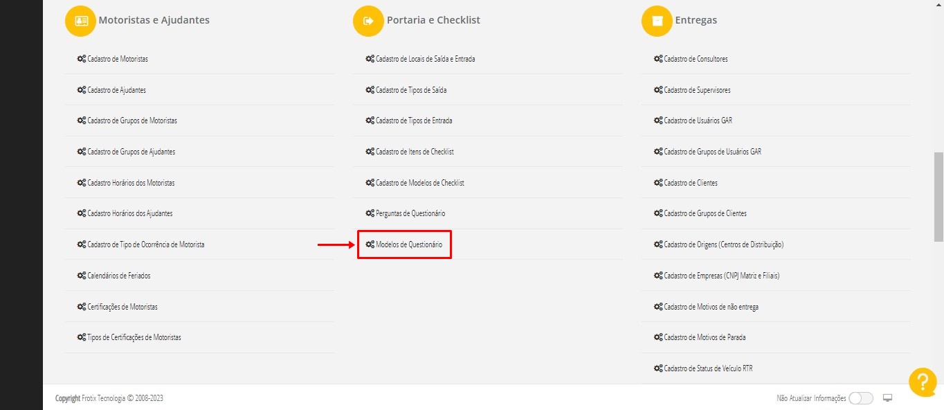 2. Selecionar “Cadastro de Modelos de Questionário“: