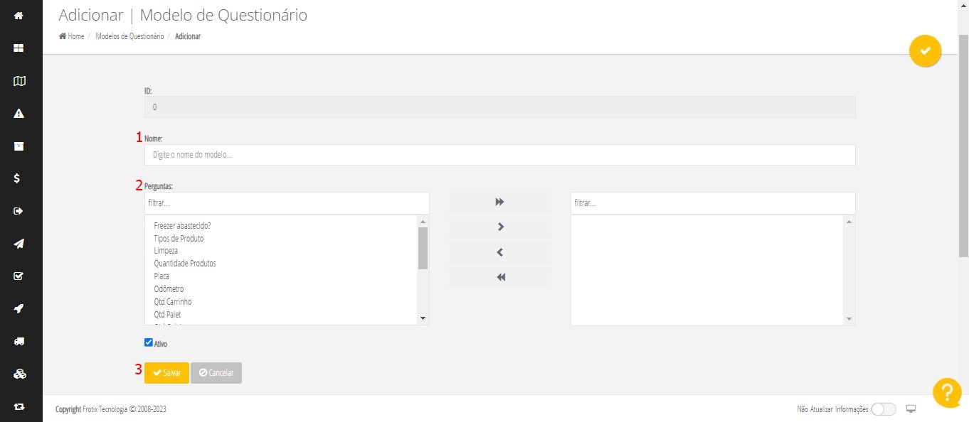 (2) Mover para o quadro da direita as perguntas que ficarão disponíveis para serem respondidas no modelo que está sendo criado na sequência desejada;