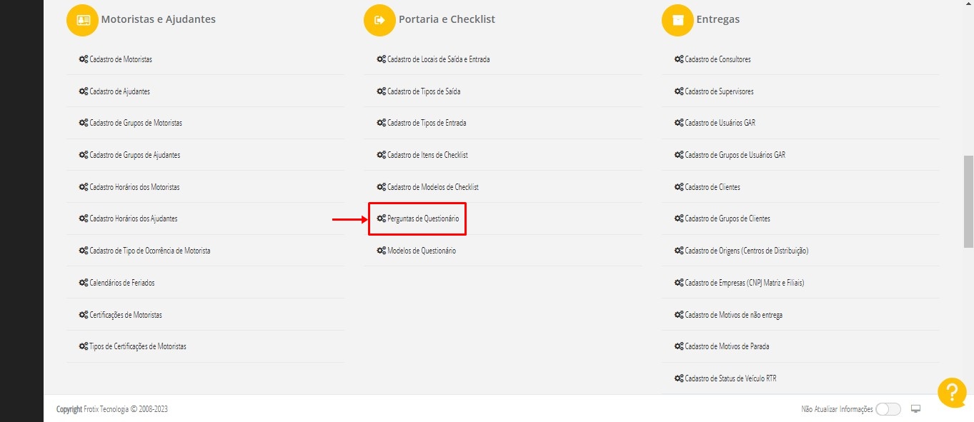 2. Selecionar “Cadastro de Perguntas de Questionário“: