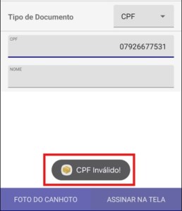 Obs.: Caso o colaborador insira um CPF inválido (fora do padrão ou inexistente), o aplicativo não permitirá a validação da operação. Nessa situação, o app exibirá o alerta “CPF inválido”, impedindo a continuidade do processo até que um CPF válido seja informado.