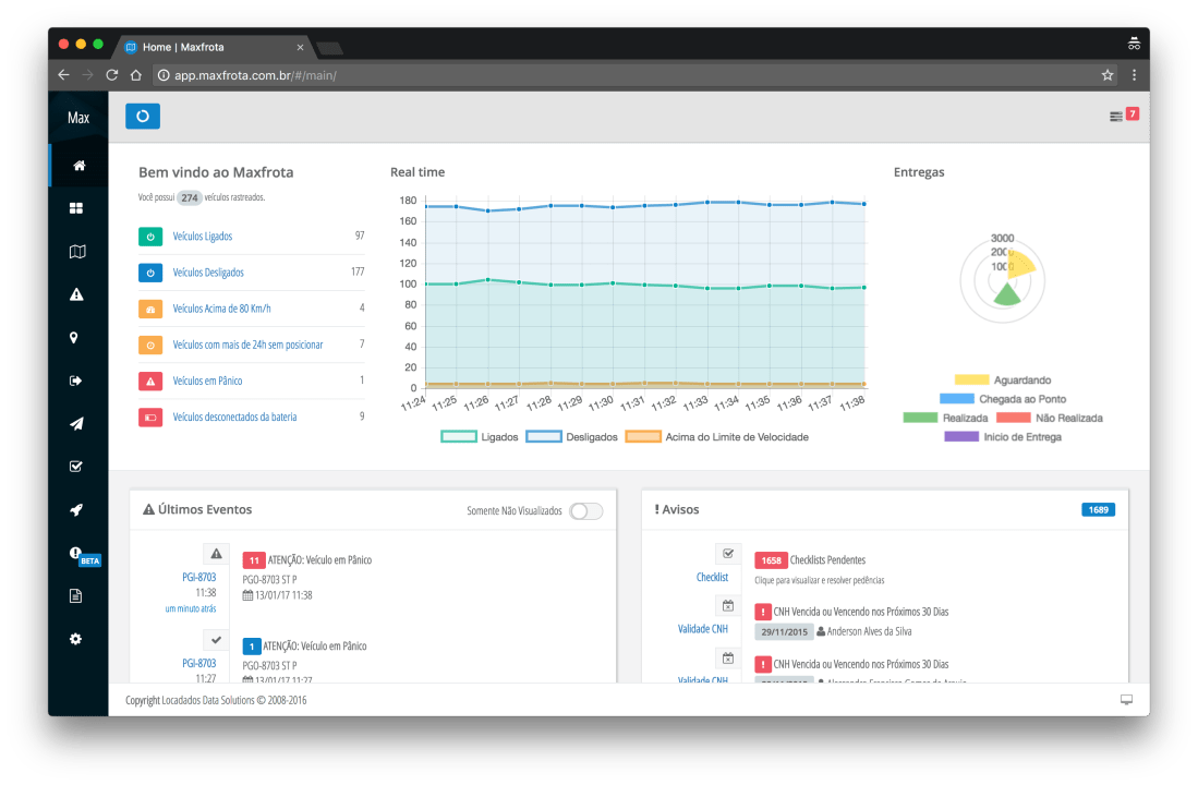 No lado esquerdo superior é possível visualizar de forma rápida a quantidade de veículos ligados, desligados, acima do limite de velocidade estabelecido pelo usuário, veículos com mais de 24 horas sem posicionar, com botão de pânico acionado e veículos com o rastreador desconectados da bateria (usando bateria interna). Na parte superior central um quantitativo minuto a minuto é exibido.